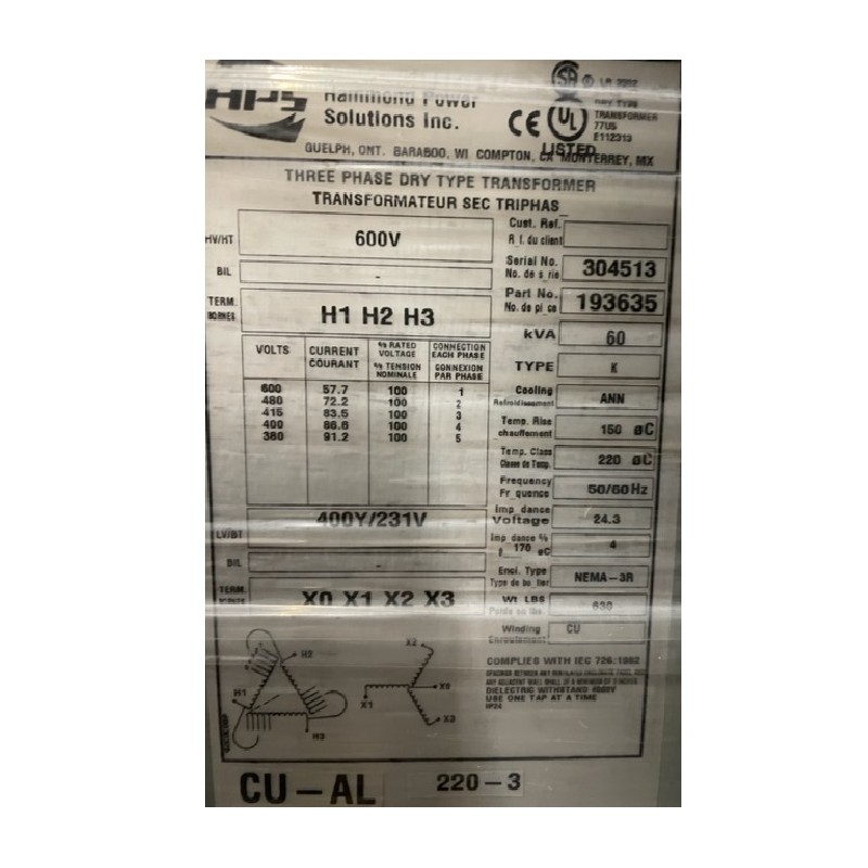 TRANSFORMATEUR 60KVA 600/400/231 1PH NEUF CUIVRE